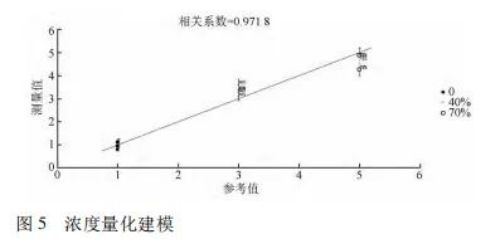 濃度量化建模采用的方法為偏最小二乘法(PLS),可使色譜圖數(shù)據(jù)與濃度值間建立線性關(guān)系,起到對(duì)未知樣品濃度進(jìn)行預(yù)測(cè)的作用。本實(shí)驗(yàn)中采用預(yù)先調(diào)配的金銀花粉末,將摻入完全開花粉末比例設(shè)為濃度,即濃度量化建模中的因變量,以所測(cè)得氣相色譜圖數(shù)據(jù)作為自變量,進(jìn)行濃度量化建模。為實(shí)現(xiàn)較好的鑒別結(jié)果,將PCA及DFA組間區(qū)分較為良好的0,40%,70%完全開花金銀花粉末摻入比例作為節(jié)點(diǎn),并將0,40%,70%濃度分別設(shè)為1,3,5,進(jìn)行濃度量化建模,所得結(jié)果見圖5,相關(guān)系數(shù)為0.9718。建模后,將10%,20%,30%,50%,60%,80%,90%,100%的原始色譜數(shù)據(jù)進(jìn)行投影驗(yàn)證,可得到較好的濃度預(yù)測(cè)結(jié)果,模型良好。另外,根據(jù)此模型,可實(shí)現(xiàn)基于摻入完全開花金銀花粉末比例的質(zhì)量分級(jí),即濃度預(yù)測(cè)結(jié)果小于3,為金銀花粉末中摻入完全開花粉末量低于40%,列為一等;濃度預(yù)測(cè)結(jié)果不低于3且小于5,為金銀花粉末中摻入完全開花粉末量在40%~70%,列為二等;濃度預(yù)測(cè)結(jié)果不低于5,為金銀花粉末中摻入完全開花粉末量不低于70%,列為三等。