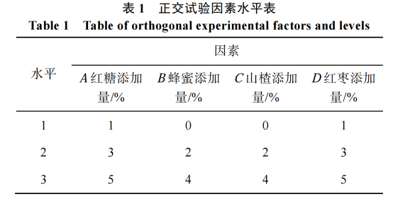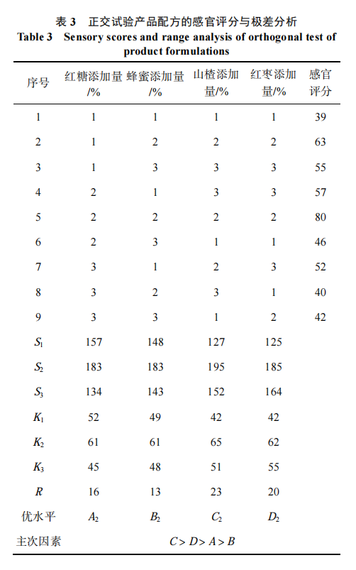 以單因素試驗為基礎(chǔ), 選擇紅糖、蜂蜜、山楂、紅棗的添加量為正交試驗的 4 個因素, 采用四因素三水平 L9(34)正交試驗, 綜合產(chǎn)品的感官評分值和極差分析得到 4 個因素的最佳添加量, 正交試驗因素水平見表 1。