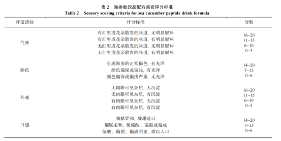 由 10 人組成感官評定小組, 分別對海參肽飲品配方的氣味、顏色、外觀、口感進行感官評定并打分, 每項分?jǐn)?shù)為 20 分, 滿分為 80 分, 評分標(biāo)準(zhǔn)見表 2。