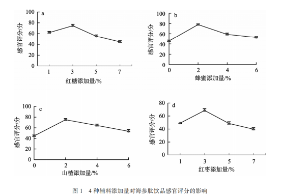 首先選擇 7 種具有一定營養(yǎng)價值的藥食同源的輔料進行海參肽飲品調(diào)配, 其次選擇對飲品感官品質(zhì)影響較明顯的紅糖、蜂蜜、山楂、紅棗 4 種輔料進行單因素試驗。以海參酶解液為基礎(chǔ), 添加重量計為 100%, 其中加入酶解液添加重量 0.3%的桑葚粉、0.3%的藍(lán)莓粉和 1%的茉莉花, 制成海參肽復(fù)配液為固定值, 感官評分為指標(biāo)。固定 2%的蜂蜜添加量, 2%的山楂添加量, 3%的紅棗添加量, 考察紅糖添加量為 1%、3%、5%和 7%對海參肽飲品感官品質(zhì)的影響。固定紅糖添加量, 2%的山楂添加量, 3%的紅棗添加量, 考察蜂蜜添加量為 0%、2%、4%和 6%對海參肽飲品感官品質(zhì)的影響。固定紅糖添加量和蜂蜜添加量, 3%的紅棗添加量, 考察山楂添加量為 0%、2%、4%和6%對海參肽飲品感官品質(zhì)的影響。固定紅糖、蜂蜜和山楂的添加量, 考察紅棗添加量為 1%、3%、5%和 7%對海參肽飲品感官品質(zhì)的影響。