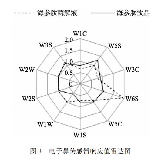 采用主成分分析法(PCA)評價海參肽酶解液與海參肽飲品的揮發(fā)性特征。由圖 2 可知, 主成分 1 的方差貢獻率為 86.19%, 主成分2 的方差貢獻率為 11.28%, 兩成分的總貢獻率為97.47% (>85%), 說明這 2 個主成分可以反映樣品香氣的整體信息。樣品在第一主成分上的距離越大, 則差異越大。由圖 2 可以看出, 2 種樣品在第一主成分上距離較大, 說明2 種樣品間的氣味成分差異較大, 產(chǎn)生這種現(xiàn)象的原因可能是添加輔料中的成分所起的作用。本研究選用 140 s 時各傳感器穩(wěn)態(tài)響應(yīng)值作為分析點建立雷達(dá)圖, 各傳感器響應(yīng)值越高表明相對應(yīng)的該類物質(zhì)含量越高。如圖3 所示, W5S、W6S、W5C、W2S、W2W 和 W3S 傳感器對海參肽飲品的香氣敏感, 表明氮氧化物、氫化物、烷烴、醇類、硫化氫類、芳香烷烴這些物質(zhì)在海參肽飲品中含量較高。