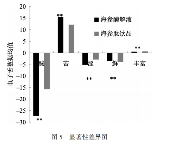 海參酶解液與海參肽飲品的電子舌檢測結(jié)果見圖 4, 結(jié)合顯著性分析(見圖 5)可以看出, 海參肽飲品與海參肽酶解液的酸味、苦味、澀味、鮮味、豐富度存在明顯差異, 其余則差異性不顯著, 引起這種現(xiàn)象的原因可能是由于海參肽飲品中加入了輔料, 其中山楂對其感官影響最大, 其次是紅糖、紅棗、蜂蜜。