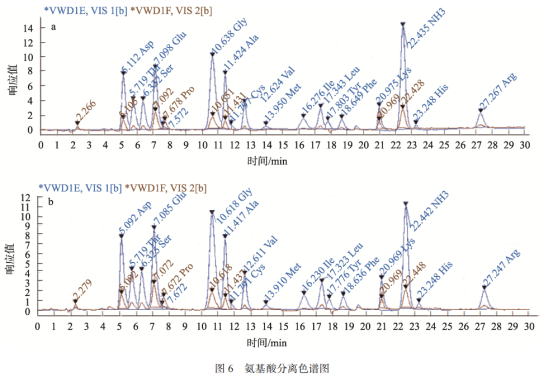 海參肽飲品氨基酸檢測結(jié)果見圖 6。圖 6a 為氨基酸混標(biāo)分離色譜圖, 由圖 6a 可以看出, 氨基酸在 30 min 內(nèi)分離效果良好; 圖 6b 為海參肽飲品樣品分離色譜圖, 由圖 6b 可以看出各氨基酸出峰良好, 出峰時間與氨基酸混標(biāo)出峰時間一致, 表明此方法獲得氨基酸含量準(zhǔn)確。海參肽飲品中的 17 種氨基酸在氨基酸分析儀上獲得了較優(yōu)的分離, 在 440 nm 波長下測定脯氨酸, 570 nm 波長下測定其余氨基酸。