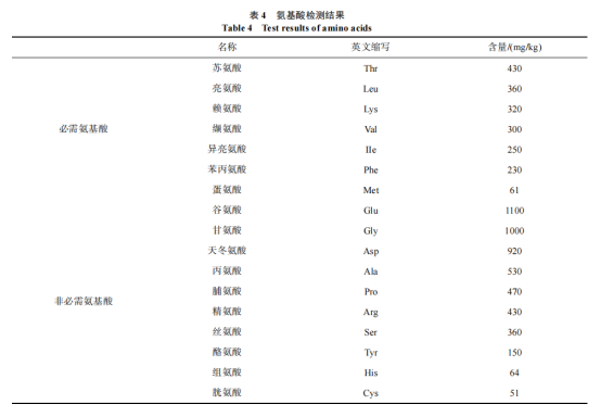 海參中含有 18 種氨基酸, 8 種為必需氨基酸, 本研究檢測了海參肽飲品中的 17 種氨基酸, 檢測結(jié)果見表 4。由表 4 可以看出, 本海參肽飲品中有 7 種必需氨基酸, 10 種非必需氨基酸, 17 種氨基酸總量為 7026 mg/kg。其中谷氨酸含量最高, 可達(dá)到 1100 mg/kg, 占氨基酸總量的 16%,谷氨酸是一種功能性氨基酸, 參與蛋白質(zhì)的合成和氧化供能, 具有抗氧化能力和促進腸道發(fā)育的作用, 同時也是海參肽飲品中重要的鮮味物質(zhì)。其次是甘氨酸和天冬氨酸, 含量分別占氨基酸總量的 14%和 13%。甘氨酸參與體內(nèi)多種代謝過程, 在預(yù)防酒精性肝病和免疫調(diào)節(jié)等多種方面都發(fā)揮重要作用。胱氨酸、蛋氨酸與組氨酸含量最少,占氨基酸總量的 0.7%、0.9%和 0.9%, 其余氨基酸占比范圍在 2%~8%之間。另外測得海參肽飲品蛋白質(zhì)含量為7.05 mg/mL、脂肪含量為 0 mg/mL。說明此海參肽飲品含有豐富的蛋白質(zhì)與多種氨基酸, 營養(yǎng)價值豐富。