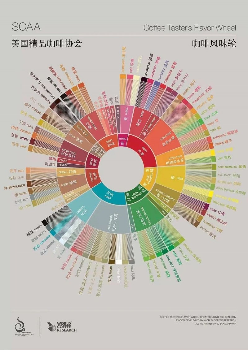 隨著食品行業(yè)工業(yè)化的快速發(fā)展,感官風(fēng)味輪涉及的領(lǐng)域越來(lái)越廣泛,比如中國(guó)近幾年出現(xiàn)的白酒、茶葉、陳醋等感官風(fēng)味輪。同時(shí),專(zhuān)家們對(duì)于各自領(lǐng)域的感官風(fēng)味輪研究越來(lái)越深入,比如咖啡領(lǐng)域的第一版風(fēng)味輪是Ted Lingle與The Coffee Brewing Institute基于化學(xué)層面的研究于1983年構(gòu)建起來(lái),第二版風(fēng)味輪是SCAA基于感官層面的研究于2016年構(gòu)建的。這不僅拓展了人們對(duì)咖啡風(fēng)味的新認(rèn)知,也為咖啡領(lǐng)域的發(fā)展助力。