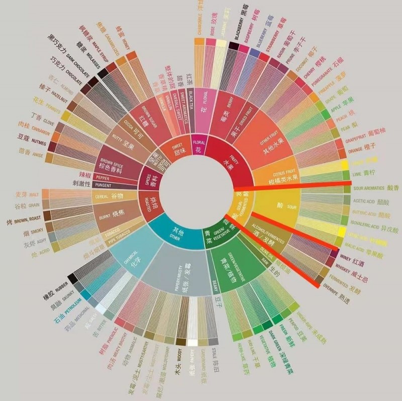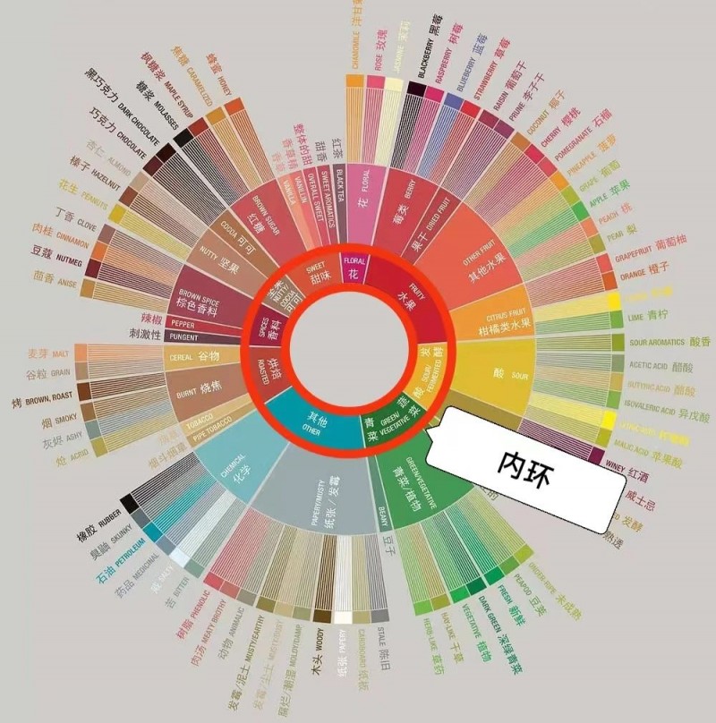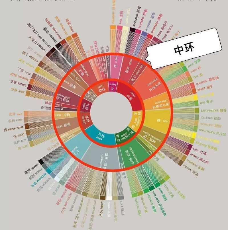 中環(huán)代表同一類(lèi)別中的不同細(xì)分。我們?cè)诓檎抑协h(huán)相對(duì)應(yīng)的感官描述詞時(shí),首先要確定內(nèi)環(huán)類(lèi)別,然后進(jìn)一步在此類(lèi)別對(duì)應(yīng)的中環(huán)范圍內(nèi)查找。