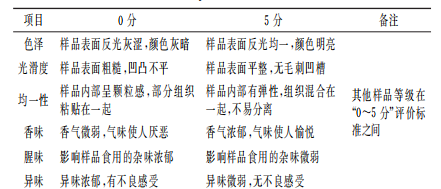 參加感官評價的20位食品專業(yè)的學生都具備一定感官評定基礎,且預先進行過感官實驗的培訓。每種樣品從看、聞、嘗3個方面進行評價,分別就色澤、光滑度、均一性、香味、腥味、異味、嫩度、油膩度、整體口感9個指標打分,每種指標總分5分,具體標準見表1。感官評價時隨機抽取10名學生組成感官評定小組,從樣品的色澤、組織狀態(tài)、氣味、滋味4個方面進行感官評價。每次感官品鑒之前需用飲用水漱口,評價時不能互相討論。