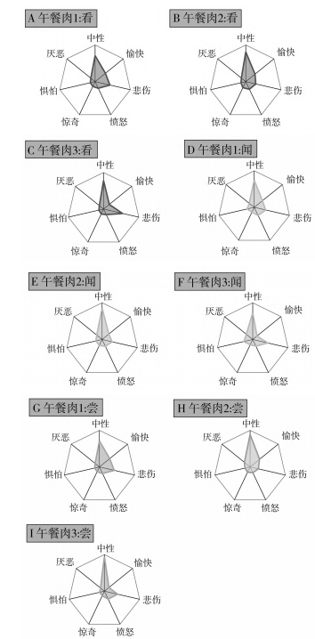 從“看”(視覺)分析得到的情緒雷達圖見圖2中A~C,能區(qū)別樣品口味的情緒是“悲傷”,午餐肉3占比最高,午餐肉2占比最低。受試者進行感官評價前,無影響情緒波動的因素存在,因此受試者的情緒表現(xiàn)與食物有關。在此實驗中,午餐肉3的消極評價更高,午餐肉2的消極評價最低,說明午餐肉2的外部整體特征更能提高實驗者的食欲。從“聞”(嗅覺)分析得到的情緒雷達圖見圖2中D~F,午餐肉1的氣味積極因素更多,“愉悅”情緒占比較大;而午餐肉3的氣味積極因素較少,消極因素更多。說明從氣味上判斷,午餐肉1的氣味更令人有食欲。從“嘗”(味覺)分析得到的情緒雷達圖見圖2中G~I,午餐肉1和午餐肉2的口感“愉悅”情緒顯著高于午餐肉3;而午餐肉1和午餐肉3的“悲傷”情緒顯著高于午餐肉2,說明從口感上判斷,午餐肉2更能提高實驗者的食欲。雖然從嗅覺評價上午餐肉1的氣味最佳,但從視覺和味覺上評價,午餐肉2的外觀和口感最佳。此結論與傳統(tǒng)的感官評價結論一致,午餐肉2是口感最佳的午餐肉樣品。