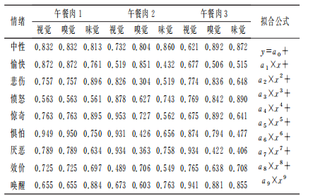 人們對食物是否可口的判斷也是持續(xù)變化的過程,這個過程包括食物外觀質地的判斷、氣味的甄別和口感的體驗等,因此圖3~圖5分別從視覺、嗅覺和味覺3個方面,持續(xù)觀察了感官評價人員的情緒變化。由圖3~圖5可知,擬合曲線的變化趨勢與實際變化趨勢一致,由表2可知,缺失值較少的曲線擬合效果較好。同時圖3~圖5中也分析了實驗人員的情緒效價和喚醒因素。