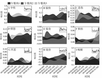 實驗人員觀察3種午餐肉時,情緒喚醒響應值維持在0.3左右,機體對樣品的反應強度類似。“中性”表示未引起實驗者情緒表達,“中性”值越高,情緒表達越低。“愉快”和“驚奇”的響應值越高,越能說明樣品的可接受度高;而“悲傷”、“憤怒”、“懼怕”和“厭惡”的響應值越高,說明樣品的可接受度越低。為了描述便利,本文將“中性”標為情緒壓制,“愉快”和“驚奇”2種情緒稱為積極情緒,“悲傷”、“憤怒”、“懼怕”和“厭惡”4種情緒稱為消極情緒。從視覺上分析,午餐肉2引起實驗者的情緒表達最高,午餐肉1最低;午餐肉3的積極情緒響應值明顯低于另外兩種,而午餐肉1比午餐肉2更能使人感到愉悅。從觀測時間上看,午餐肉1“愉快”響應值突降的時間正是午餐肉2“驚奇”響應值陡增的時間,說明情緒的分配是不平衡的,也可以反映出隨著觀察深入,午餐肉2的某些特征更能獲取實驗者的青睞。從消極情緒上看,3種午餐肉“憤怒”和“厭惡”的響應值接近,而“悲傷”和“懼怕”的響應值差異更顯著,而這兩種消極情緒都表明午餐肉3的接受度最低,午餐肉2的接受度最高。此結論和傳統(tǒng)的感官評價結論一致,都表明午餐肉2的外觀更能讓人相信食物“美味”。