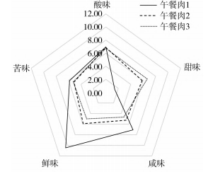 由圖5可知,午餐肉2的情緒反應最高,午餐肉1的情緒反應最低;從積極情緒上分析,午餐肉2使人感到“愉快”和“驚奇”,午餐肉1次之,午餐肉3最低。從消極情緒上判斷,午餐肉3令人感到“悲傷”和“厭惡”,午餐肉1令人感到“憤怒”和“懼怕”,說明午餐肉3的口感更不盡如人意,而午餐肉1的口感與實驗者期待的滋味差別較大。因此,味覺實驗表明,午餐肉2的口感可接受度最高,這與感官評價的結論一致。電子舌分析結果