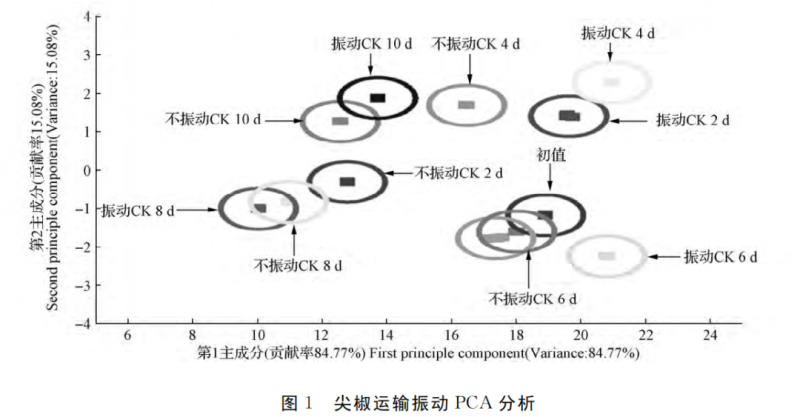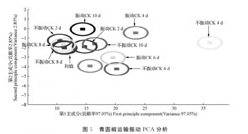 如圖5所 示,為運輸振動 CK 和不振動 CK青圓椒的 PCA 分析圖(A 組),2組的尖椒主成分1的貢獻率 為 97.05%,主成分 2 的貢獻率為2.85%,總貢獻率 為99.90%。表明2個主成分已經(jīng)基本代表了樣品的主要信息特征,電子鼻能夠?qū)悠泛唾A藏時間加以區(qū)分。從 圖5可以看出,青圓椒的振動 CK 和不振動 CK10d內(nèi)的揮發(fā)性物質(zhì)成分區(qū)域較為接近,且不同貯藏時間內(nèi)揮發(fā)性物質(zhì)成分區(qū)域有重疊,說明振動組和不振動組貯藏10d內(nèi)的青圓椒果實揮發(fā)性物質(zhì)變化不大,在貯藏期內(nèi),運輸振動和不振動對青圓椒的氣味影響不大,均可保持青圓椒的香氣。