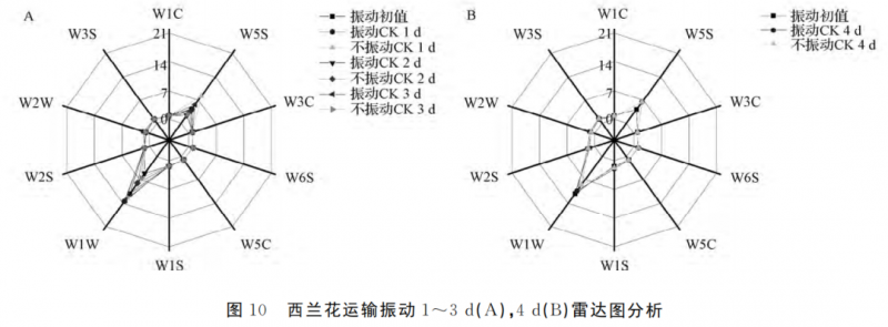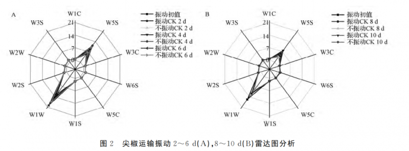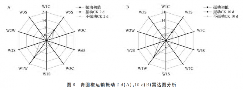 圖10(A)為西蘭花前3d的雷達圖(B 組),前3d西蘭花的氣味變化并不明顯,均接近初值,說明此時的西蘭花新鮮,具有商品價值。4d西蘭花的氣味與 初 值 相 比 明 顯 改 變,2號 和7號 傳感器的響應(yīng)值變化明顯,此時西蘭花腐爛變質(zhì),出現(xiàn)其它氣味,失去商品價值。不振動 CK 組的氣味明顯好于振動 CK 組,說明振動影響西蘭花組織表皮細胞的滲透和細胞壁的降解,并影響運輸后西蘭花的硬度和外部變化,降低商品價值。