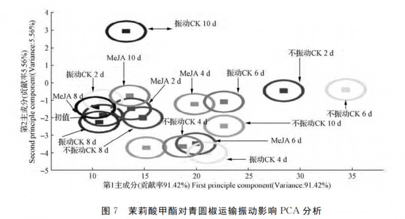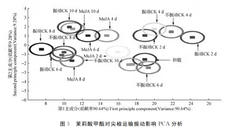 對振動組和 MeJA 處理組的尖椒、青 圓 椒 和西蘭花進行檢測,分析運輸振動對蔬菜變化與電子鼻無損檢測間的關(guān)系,利用對傳感器響應(yīng)值進行PCA 方法的分析,實現(xiàn)了蔬菜運輸振動后的新鮮度鑒別。當采用 PCA 方 法分 析 時,電 子 鼻 可以區(qū)分處理組與對照組的蔬菜,并且可以區(qū)分不同貯藏時間的尖椒和西蘭花。采用雷達圖分析方法可得出,傳感器 W5S、W1W 在檢測中作用最大,對區(qū)分蔬菜是否新鮮,是否有商品價值貢獻最大。不振動組的尖椒和西蘭花的氣味改變較小,青圓椒的不振動組和振動組的氣味變化不大,所以減小運輸過程中果蔬的振動可以有效提高果蔬的商品價值。MeJA 可通過激活植物的防御反應(yīng)和修復(fù)外來機械損傷來調(diào)控果蔬的品質(zhì),用MeJA 處理振動 后 的 尖 椒、青圓椒和西蘭花可以有效抑制尖椒、青圓椒和西蘭花氣味的改變。