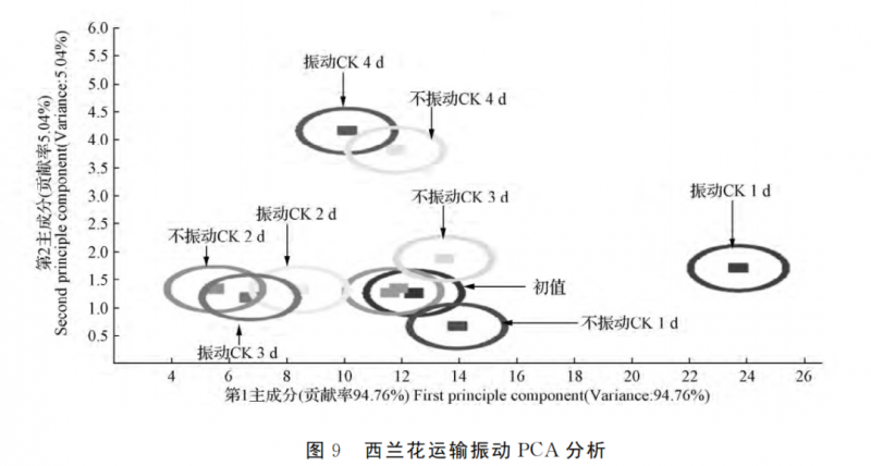 如圖9所示,振動 CK 組和不振動 CK 組(A組)的西蘭花主成分1的貢獻率為94.76%,主成分2 的貢獻率為 5.04%,總貢獻率為 99.80%。表明2個主成分已經(jīng)基本代表了樣品的主要信息特征,電子鼻能夠?qū)悠泛唾A藏時間加以區(qū)分。前3d,振動 CK 組和不振動 CK 組的揮發(fā)性物質(zhì)成分區(qū)域接近初值,4d均遠離初值,西蘭花的揮發(fā)性物質(zhì)在4d發(fā) 生 改 變,此時西蘭花的新鮮度降低,失去商品價值。在相同貯藏時間下,不振動CK 組比振動 CK 組揮發(fā)性物質(zhì)成分區(qū)域更接近初值,說明在相同貯藏天數(shù)下,西蘭花經(jīng)過振動后,氣味更容易發(fā)生改變。運輸過程中更容易使西蘭花發(fā)生損傷,如擦傷、淤傷和擦傷帶有淤傷,這些擦傷會減少西蘭花貯藏時間,使西蘭花更易腐敗。