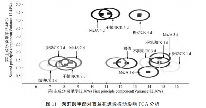 如圖11所示,清水CK 組和振動 MeJA 組(B組)的西蘭花主成分1的貢獻率為82.36%,主成分2的貢獻率為17.44%,總貢獻率 為99.80%。表明2個主成分已經(jīng)基本代表了樣品的主要信息特征,電子鼻能夠?qū)悠泛唾A藏時間加以區(qū)分。如圖11所示,2d后振動清水 CK 組、不振動清水CK 組和振動 MeJA 組的揮發(fā)性物質(zhì)成分區(qū)域遠離初值,說明經(jīng)過清水浸泡的西蘭花,比未經(jīng)過清水浸泡的西蘭花更容易腐敗,貯藏2d氣味就改變較為明顯。在相同貯藏時間下,經(jīng)過 MeJA 處理的西蘭花揮發(fā)性物質(zhì)成分區(qū)域距離初值較為接近,說明,運輸振動后的西蘭花,經(jīng)過 MeJA 浸泡可以有效減弱西蘭花氣味的改變,提高商品價值和貯藏品質(zhì)。貯 藏4d后,西蘭花氣味改變較為明顯,此時西蘭花完全失去商品價值。