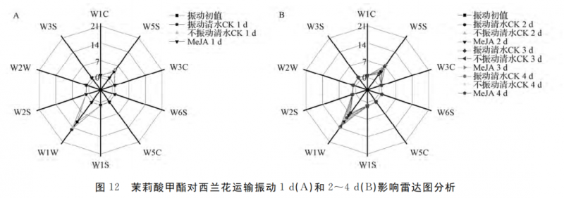 如圖12所示,2號和7號傳感器的響應(yīng)值變化明顯。圖12(A)所示,貯藏1d時,不振動清水CK 組、振動清水 CK 組和振動 MeJA 組(B組)的西蘭花氣味變化均不大,說明貯藏1d西蘭花新鮮,具有較高的商品價值。MeJA 處理過的西蘭花與振動清水CK和不振動清水CK相比更接近初值,說明,用 MeJA處理振動后的西蘭花可以有效降低西蘭花的損傷,提高其商品價值。圖12(B)所 示,2d后,西蘭花的氣味改變明顯,經(jīng)過 MeJA 處理后的西蘭花氣味變化較小,因此用 MeJA 處理可以有效抑制振動后的西蘭花氣味變化,延長貨架期。