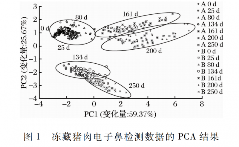 樣品凍結(jié)后,分別在第0、25、80、134、161、200、250天對(duì)樣品進(jìn)行電子鼻檢測(cè)。樣品每次檢測(cè)完成后,迅速用保鮮膜重新密封燒杯放回 -20 ℃繼續(xù)冷凍儲(chǔ)藏,檢測(cè)過程中保持低溫使樣品不發(fā)生解凍。