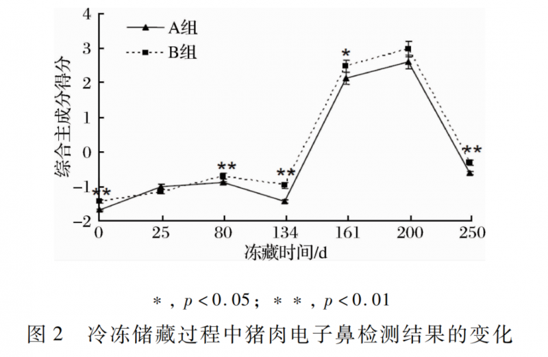 從圖 2可見,在第 0,80,134,161,250天時(shí) A,B兩組間檢測(cè)結(jié)果差異顯著,而第 25 和 200 天時(shí) A,B兩組間檢測(cè)結(jié)果差異不顯著(p>0.05)。這表明經(jīng)過 7d冷藏后再凍藏的豬肉與新鮮凍藏的豬肉相比可能已經(jīng)發(fā)生了變化,但在凍藏過程中發(fā)生劣變可能又掩蓋了其本身的差異,但隨著凍藏時(shí)間的增加其氣味成分的差異又逐漸加大。盡管 200d 時(shí)的差異也不顯著,則是可能是由于組內(nèi)變異過大掩蓋了組間差異造成的,其平均值之間的差異仍在增大。