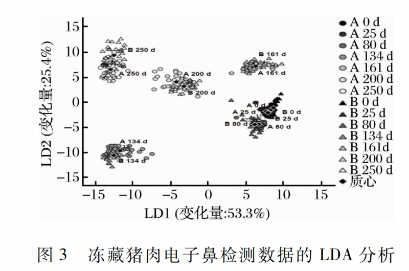 為建立相應(yīng)的預(yù)測(cè)模型,采用 LDA方法對(duì)數(shù)據(jù)進(jìn)一步分析。LDA一種常用的分類方法,立足與找到反映兩類物體或事件特征的一個(gè)線性組合,以特征化或區(qū)分不同的樣本集。對(duì)冷凍儲(chǔ)藏 0、25、80、134、161、200、250d共 420 個(gè)豬肉樣品數(shù)據(jù)按照分組方式和凍藏時(shí)間分為 14 個(gè)類別進(jìn)行 LDA分析,結(jié)果如圖 3所 示。用 于 作 圖 的 判 別 函 數(shù) 其 總 貢 獻(xiàn) 率 為 78.7%,其中第一判別函數(shù)貢獻(xiàn)率為 53.3%,第二判別函數(shù)貢獻(xiàn)率為 25.4%。由圖 3可知,經(jīng)過 LDA分析后,除了凍藏第 0 和 25 d的數(shù)據(jù)重合度較高外,其余第 80~250d的數(shù)據(jù)都能較好區(qū)分,說明在凍藏 1個(gè)月內(nèi)豬肉樣品的劣變幾乎沒有發(fā)生,但隨著凍藏時(shí)間的增加凍藏豬肉的變化越來越顯著。同時(shí)在第134,161,200和 250d處 A、B組樣品的組質(zhì)心分離明顯,與主成分得分的非參檢驗(yàn)結(jié)果類似。