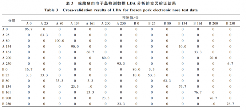 為評(píng)估 LDA對(duì)豬肉凍藏時(shí)間和凍藏前是否經(jīng)過長時(shí)間冷藏的鑒別能力,采用“留一法”對(duì)樣品進(jìn)行交叉驗(yàn)證,結(jié)果見表 3。結(jié)果表明對(duì)這 14 類樣品的交叉驗(yàn)證的正確率為 78.1%,值得注意的是即使發(fā)生錯(cuò)判的樣品也主要是在相同凍藏時(shí)間點(diǎn)的 A、B兩組之間,如僅以凍藏時(shí)間分組其交叉驗(yàn)證的正確率高達(dá) 95.6%。這表明利用 LDA對(duì)豬肉凍藏時(shí)間和凍藏前是否經(jīng)過長時(shí)間冷藏均具有較好的鑒定能力。