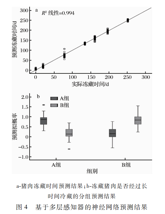 (2)線性判別分析和基于多層感知器的神經(jīng)網(wǎng)絡(luò)算法均能建立豬肉凍藏時(shí)間和凍藏前是否經(jīng)過長時(shí)間冷藏的預(yù)測(cè)模型。不過采用基于多層感知器的神經(jīng)網(wǎng)絡(luò)算法所建立的預(yù)測(cè)模型對(duì)凍藏時(shí)間預(yù)測(cè)的線性更大,回歸函數(shù)的相關(guān)性更好,對(duì)凍藏前是否經(jīng)過長時(shí)間冷藏也有更高的分組預(yù)測(cè)的準(zhǔn)確率。