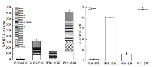 果汁酒和原果汁中均檢測到18種游離氨基酸,與百香果果汁相比,百香果果酒的甜味氨基酸(Thr、Gly、Ala、Pro、Ser)的占比增加了5.90%,苦味氨基酸(His、Met、Arg、Val、Leu、Ile、Tyr、Phe)含量也顯著下降。經(jīng)完全水解后,兩個(gè)樣品中的氨基酸含量都有所增加。