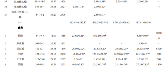 4個(gè)產(chǎn)地石榴酒中共檢測(cè)出8中酸類物質(zhì),共有物質(zhì)5種。四個(gè)產(chǎn)地的石榴酒中含量最高的均為辛酸,其濃度較低時(shí),呈令人愉悅的脂肪香和果香。