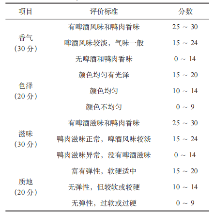 表1 啤酒鴨感官評(píng)分標(biāo)準(zhǔn)