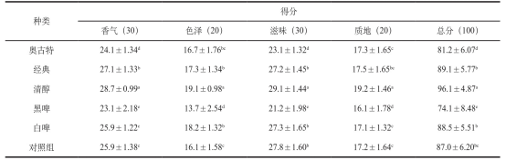 1.啤酒種類(lèi)對(duì)啤酒鴨感官評(píng)分的影響
