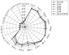 不同啤酒鴨在電子鼻各個(gè)傳感器上的響應(yīng)值如圖1所示,在T30/1、P10/1、P10/2、P40/1和T70/2這五個(gè)探頭上,啤酒鴨的響應(yīng)值存在明顯差異。