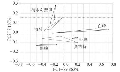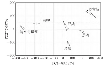 啤酒鴨電子舌檢測(cè)結(jié)果主成分分析如圖4。主成分1和主成分2的貢獻(xiàn)率分別為89.79%和7.70%,累計(jì)97.49%,說(shuō)明這兩個(gè)主成分可以代表樣品整體信息。雖然不同啤酒鴨在電子舌傳感器上響應(yīng)值差異較小,但利用主成分分析還是能將其明顯區(qū)分開(kāi),說(shuō)明不同啤酒制作的啤酒鴨滋味存在差異,其中白啤組與其他組差異較大。