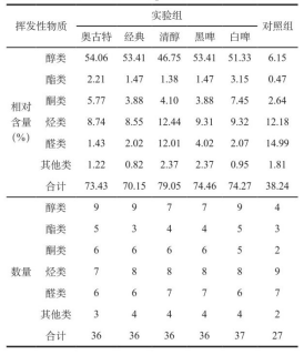 通過(guò)GC-MS測(cè)定不同種類(lèi)啤酒制作啤酒鴨樣品的風(fēng)味物質(zhì)及其相對(duì)含量。各樣品鑒得醇類(lèi)、酯類(lèi)、醛類(lèi)、酮類(lèi)、烴類(lèi)以及其他類(lèi)(醚類(lèi)、含氮類(lèi)及呋喃等)揮發(fā)性化合物,其中來(lái)源于啤酒的醇類(lèi)物質(zhì)占據(jù)實(shí)驗(yàn)組最重要位置。由表3可知,實(shí)驗(yàn)組所檢測(cè)的揮發(fā)性化合物,各樣品風(fēng)味物質(zhì)含量皆不同,但醇類(lèi)和烴類(lèi)都為其主要化合物,種類(lèi)及含量皆高于對(duì)照組。