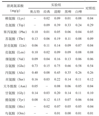由表4可知,啤酒鴨中共檢測(cè)到16種游離氨基酸,其7種人體必需氨基酸中苯丙氨酸、蘇氨酸、異亮氨酸、亮氨酸、纈氨酸在所有啤酒鴨中均有檢出。清醇組及清水對(duì)照組中各氨基酸均能檢出(16種),白啤組氨基酸種類(lèi)次之(15種),種類(lèi)最少為奧古特組(11種)。