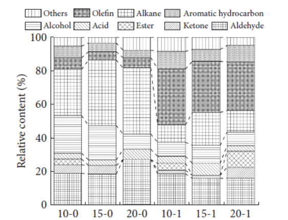 與對照組(10-0、15-0和20-0)相比,孜然組(10-1、15-1和20-1)中醛類、醇類和烷烴類相對含量減少,酯類和烯烴類相對含量增加。烤羊肉餅中的主要揮發(fā)性風(fēng)味化合物為醛類,包括戊醛、己醛、庚醛、辛醛、壬醛、癸醛、苯甲醛、(E)-2-辛烯醛等。加入孜然后,己醛含量顯著減少,這可能是由于孜然的抗氧化作用減少了關(guān)鍵醛類的氧化;孜然醛和茴香醛的含量明顯增加,這些是孜然中最豐富的成分,可能是由于在烤制過程中加入了孜然,使羊肉散發(fā)出柑橘和辛辣等香味。