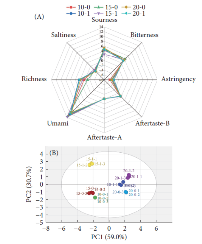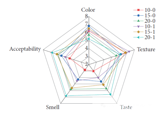 樣品感官評分最高的是20-1組,得分為31.5。感官評分表明,15-1組和20-1組的顏色得分均低于對照組,這可能是由于樣品隨著烤制時間的增加而變暗。結(jié)果表明,孜然的加入可以改善鮮味,增加孜然的特征香氣,掩蓋異味,改善酯香氣。
