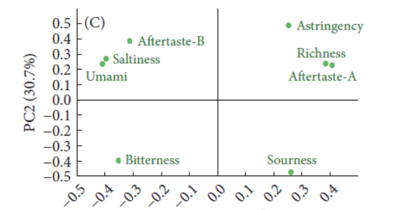 添加孜然的烤羊肉餅苦味和酸味下降,說明孜然可能通過釋放特有的揮發(fā)性風(fēng)味化合物掩蓋或混合令人不愉快的味道。PC1和PC2的貢獻率分別為59.00%和30.70%,累積方差貢獻率為89.70%(>85%),說明PC1和PC2能夠反映大量有關(guān)樣本整體特征的信息。