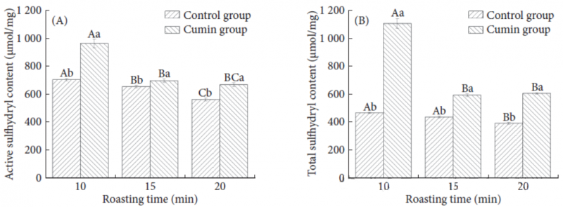 圖5  孜然對活性巰基(A)、總巰基(B)含量的影響