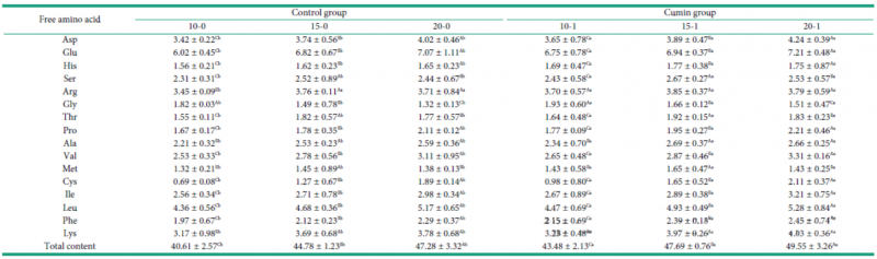 表1  孜然對烤羊肉餅游離氨基酸含量的影響