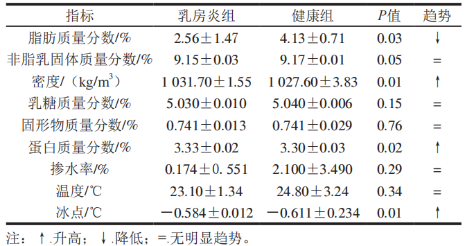 表1 乳房炎牛乳和健康乳成分含量及變化趨勢
