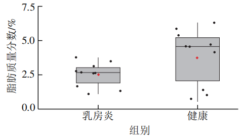 如表1和圖1所示,脂肪質(zhì)量分數(shù)、密度、蛋白質(zhì)量分數(shù)、冰點個指標P值均小于0.05,具有顯著差異,與健康組相比,乳房炎組牛乳脂肪質(zhì)量分數(shù)顯著降低P0.05)。脂肪在體細胞數(shù)量較多的牛乳中顯著下降,可能是由于乳房發(fā)炎期間乳腺細胞合成和分泌能力下降。乳房炎牛乳中蛋白質(zhì)含量增加,可能是由于奶牛患乳房炎后會增加乳房毛細血管的通透性,從而使蛋白含量增加。其余指標在兩種牛乳間差異不顯著(P0.05)。