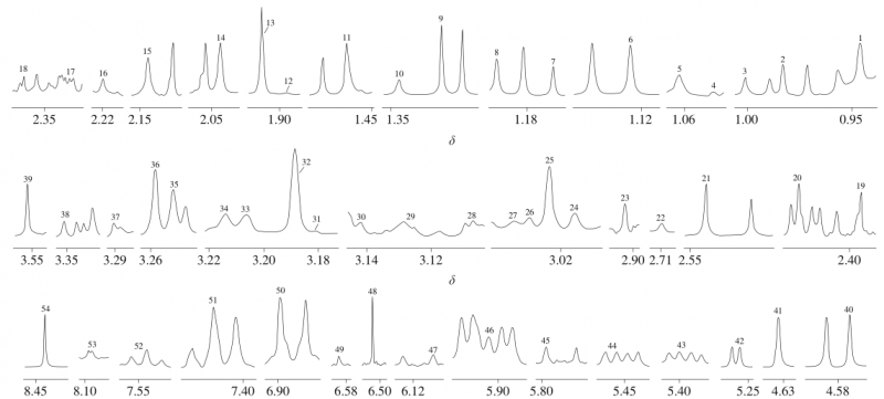如圖4所示,利用基于H NMR的代謝組學技術從牛乳樣本中共精確定性和定量54 種分子,主要為氨基酸、有機酸、碳水化合物、核苷、核苷酸及其衍生物等化合物。