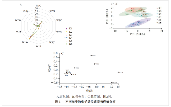 利用電子鼻對不同烘焙程度以及不同產(chǎn)地咖啡的風味輪廓進行快速檢測分析,圖1A結(jié)果表明,傳感器W5S、W1W、W2W的響應(yīng)值較大,這3種傳感器分別對氮氧化合物、有機硫化物和無機硫化物反應(yīng)靈敏。各樣品在W1W、W2W傳感器響應(yīng)值的差異更大,表明二者對咖啡揮發(fā)性氣味的區(qū)分效果更好。6種樣品的雷達圖輪廓相似,為分辨不同樣品是否存在差異性,利用PCA模型降維后進一步分析,不同咖啡樣品能夠得到初步區(qū)分。如圖1B所示,6 個樣品分為3 組,各組整體輪廓較為接近。K1~K4樣品具有相同的咖啡配比,烘焙程度依次增加。K1與K2咖啡輪廓相交,說明淺度烘焙樣品之間相似,與中度、中深度烘焙樣品的差異較大。電子鼻可以區(qū)分不同烘焙程度的咖啡。如圖1C所示,對氮氧化合物敏感的傳感器W5S與淺度烘焙的樣品呈正相關(guān)性。K3與K6咖啡同為中度烘焙;K4與K5咖啡同為中深度烘焙,然而K4與K6咖啡由于甲基類物質(zhì)的含量相似使二者輪廓有所重疊,同時K3與K5咖啡在硫化物成分含量的影響下輪廓相似。這說明不同種咖啡的調(diào)配會影響烘焙程度感觀的差異,使中度烘焙的咖啡具有與中深度烘焙類似的感官,反之亦然。