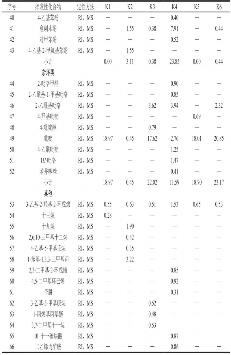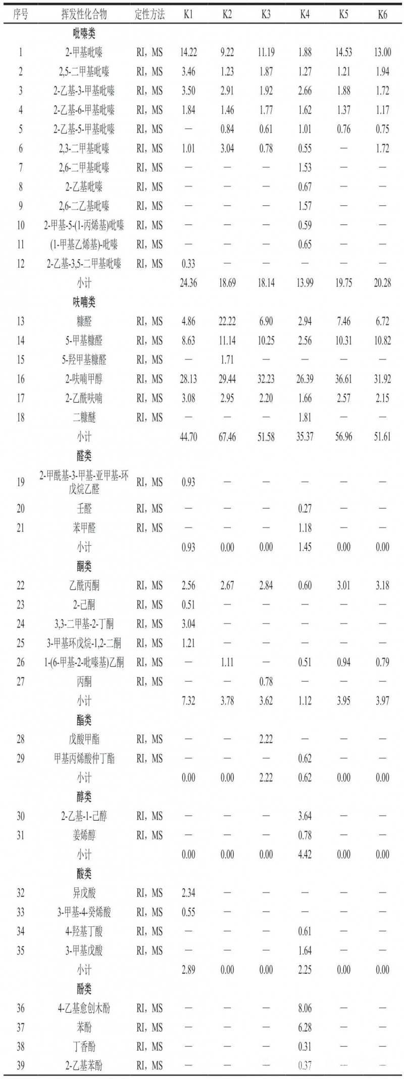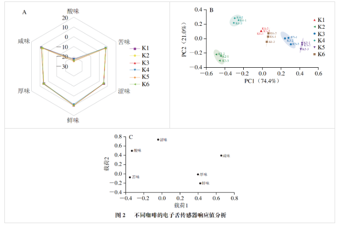 利用電子舌快速分析滋味輪廓,如圖2A所示。6種樣品的雷達圖輪廓類似,只有酸味傳感器的響應(yīng)值為負,說明酸味對咖啡整體滋味的貢獻較小。各樣品在鮮味與咸味傳感器上的響應(yīng)值差異最大,表明這兩種傳感器對滋味特征的區(qū)分效果最好。為根據(jù)滋味特征進一步區(qū)分6種咖啡,對電子舌傳感器響應(yīng)值結(jié)果進行PCA(圖2B)。6種咖啡輪廓未重疊,滋味特征明顯,易被區(qū)分。K3、K5和K6咖啡在PC1的正方向,主要受鮮味、咸味、厚味影響;K1、K2和K4咖啡在PC1的負方向,主要由澀味、酸味、苦味影響(圖2C)。每個樣品聚類的距離與滋味特征接近度相關(guān),有相同咖啡配比的K1~K4樣品,烘焙程度不同,距離較遠,說明電子舌可以區(qū)分不同烘焙度的咖啡。K5、K6咖啡分別與K1、K3咖啡輪廓接近,說明不同的咖啡配比在一定程度上能夠彌補烘焙程度的差異,使不同烘焙度的咖啡具有類似的滋味輪廓。