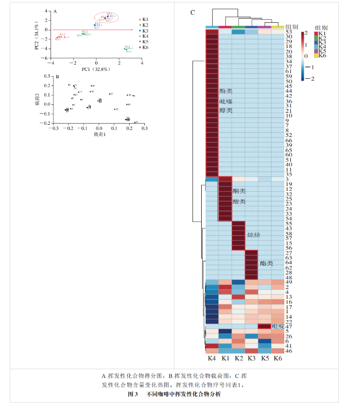 咖啡中各揮發(fā)性成分的產(chǎn)生機理相同,即通過美拉德反應(yīng)、斯特萊克降解和脂質(zhì)氧化等過程形成,可賦予咖啡不同的香氣。6 種咖啡樣品的66 種揮發(fā)性成分如表1所示。K1~K4咖啡隨著烘焙程度增加,揮發(fā)性化合物種類增多。這是由于輕度烘焙的熱加工時間較短,則各類反應(yīng)持續(xù)的時間較短,所以產(chǎn)生的化合物較少。K5、K6咖啡的埃塞爾比亞咖啡豆配比更高,可能是導致其揮發(fā)性物質(zhì)種類較少的原因。K1~K4咖啡的呋喃類物質(zhì)含量均隨烘焙程度的增加呈先上升后下降的趨勢。吡嗪類物質(zhì)隨烘焙程度的增加而減少,可能是因為六元環(huán)受熱斷裂加劇,生成烯烴類進一步揮發(fā)。為進一步探究揮發(fā)性成分的差異,進行PLS-DA,尋找導致組間區(qū)別的影響變量。由圖3A可知,各樣品間輪廓沒有重疊,K1~K4咖啡隨著烘焙程度的增加,由PC1的負半軸遷移至正半軸;與其產(chǎn)地、混合配比不同的K5與K6咖啡十分接近,但仍不重疊。顯然利用GC-MS檢測得到的揮發(fā)性成分進行不同咖啡的鑒別與區(qū)分的效果優(yōu)于電子鼻。如圖3B所示,影響淺度烘焙咖啡香氣的化合物有2-乙基-3,5-二甲基吡嗪、2-己酮、2-乙基-1-己醇等。影響中度烘焙咖啡香氣的化合物有丙酮、戊酸甲酯、4-吡啶醇等。影響中深度烘焙咖啡香氣的化合物有愈創(chuàng)木酚、2,6-二甲基吡嗪、苯甲醛等。聚類熱圖結(jié)果與得分圖結(jié)果一致。K1咖啡的特異性化合物主要是酮類和酸類,如2-己酮和異戊酸,使其有酸味和醚味。K2咖啡的特異性化合物包括十九烷、4-乙基-5-甲基壬烷等烷烴類。K3咖啡的特異性物質(zhì)有戊酸甲酯,為其增添水果味。K4咖啡獨特的木質(zhì)香、堅果香及花香分別由酚類、吡嗪類和醇類帶來,例如丁香酚、2,6-二甲基吡嗪、2-乙基-1-己醇。