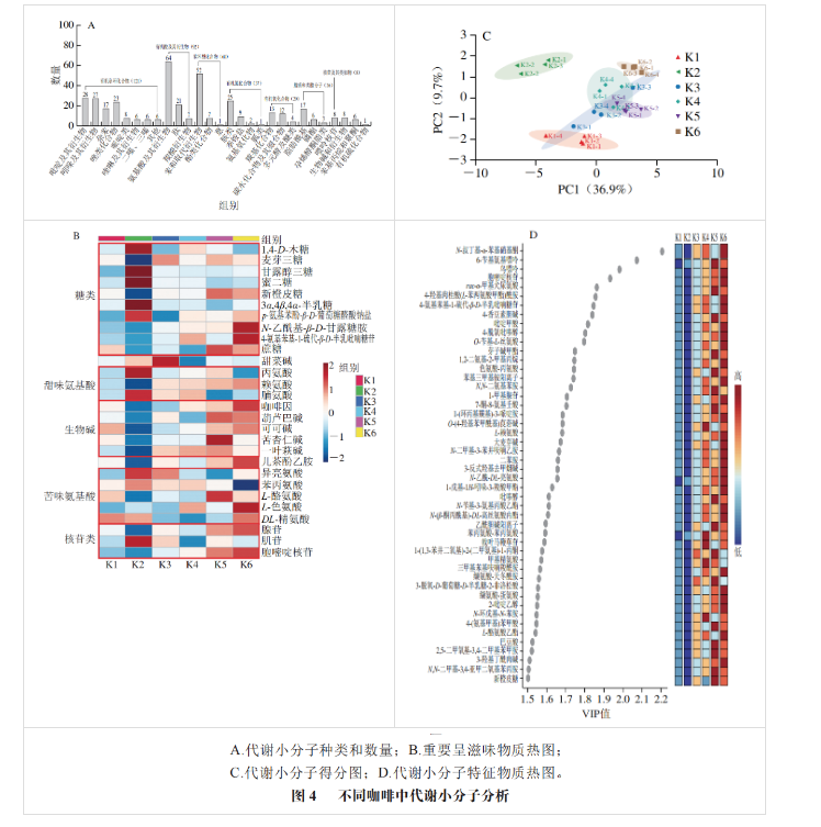 通過PLS-DA對不同咖啡代謝小分子的關(guān)系進行綜合分析。由圖4C可知,K1、K2是淺度烘焙咖啡,在PC1的負半軸,中度、中深度烘焙咖啡在PC1的正半軸、原點附近,可以明顯區(qū)分。由圖4D可知,L-酪氨酸乙酯、色氨酸-丙氨酸、纈氨酸-天冬酰胺等12種氨基酸及肽類似物,巴豆酸、戟葉馬鞭草苷等5種脂類,鳥嘌呤、1-甲基腺苷等48 個化合物是引起各樣品差異的主要差異代謝物(變量投影重要性(VIP)>1.5)。區(qū)分6 種不同咖啡的烘焙度及產(chǎn)地,可直接選用部分呈滋味化合物,如胞嘧啶核苷、賴氨酸、新橙皮糖等,但更多的是與咖啡的非呈滋味代謝物有關(guān)。有研究通過超高效液相色譜串聯(lián)質(zhì)譜進行代謝組學分析得到36 種云南小??Х扰c埃塞俄比亞咖啡的潛在標志物,包括多酚16 種、脂質(zhì)類8 種、糖類6 種以及少量生物堿類、有機酸類、萜類。