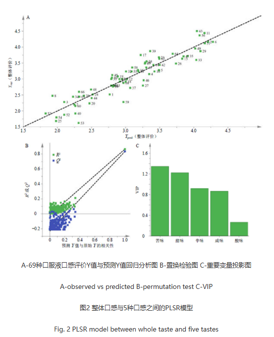 口服液整體口感預(yù)測(cè)模型:置換檢驗(yàn)的R2回歸線的Y軸截距為−0.0176,Q2回歸線的Y軸截距為−0.3290,表明建立的模型沒有出現(xiàn)過度擬合,預(yù)測(cè)能力良好;圖2-C為口嘗結(jié)果PLSR模型獲取其變量重要性投影圖,通過該模型獲取其變量重要性投影(variableimportancefortheproject,VIP)值,VIP值是反映自變量對(duì)因變量的解釋能力的重要指標(biāo),VIP值越大說明自變量對(duì)因變量解釋能力越強(qiáng),其中苦味和甜味VIP值>1,說明苦味和甜味是影響口服液整體口感的重要變量。