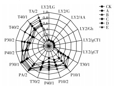 由圖3可知,不同熟度樣品之間風(fēng)味具有差異,并且樣品之間的重復(fù)性較好。PC1的貢獻(xiàn)率為70.5%,PC2的貢獻(xiàn)率為15.3%,累計貢獻(xiàn)率大于85%,說明該模型具有較高的可靠性[16]。根據(jù)樣品在PCI上的距離,可將樣品分為三類:樣品CK和A為一類,樣品B和C為一類,而樣品D、E為一類,說明在較低烹飪熟度下,樣品中的揮發(fā)性風(fēng)味物質(zhì)較少,與生肉較相似:隨著烹飪熟度的增加,即在三成熟和五成熟的條件下,牛肉中的揮發(fā)性物質(zhì)較相似,并且與對照組具有明顯差異,說明烹飪熟度會影響牛肉中揮發(fā)性風(fēng)味物質(zhì)的形成;當(dāng)烹飪熟度達(dá)到七成熟以上時,牛肉中的揮發(fā)性化合物具有高度的相似性。