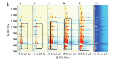 圖4是6種不同烹飪熟度的牛排揮發(fā)性風(fēng)味化合物譜圖,圖中每個點代表一種物質(zhì),淺色表示濃度較低,深色表示濃度較高,顏色越深表示濃度越大7。由圖4可知,牛排的揮發(fā)性風(fēng)味物質(zhì)能通過GC-IMS得到很好的分離,其中圖中標(biāo)記的橫線和方框處為6種不同熟度牛排中的差異性化合物,隨著牛排成熟度的增加,樣品中化合物的數(shù)量和濃度不斷增加,并且均高于對照組,其中在樣品A、B中,化合物的整體濃度較相似,即牛排介于一成熟和三成熟之間時,樣品的整體風(fēng)味輪廓較相似,而在樣品D、E中,化合物的整體風(fēng)味物質(zhì)的濃度較相似,說明牛排介于七成熟和九成熟之間時,樣品的整體輪廓較相似,與前文電子鼻結(jié)果一致。