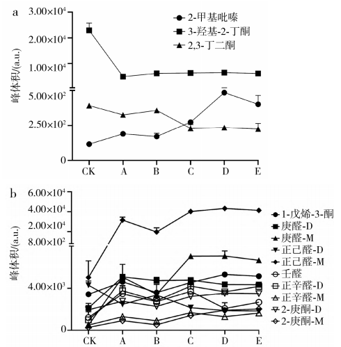 與樣品CK相比,部分化合物在樣品A、E中具有較高的含量,說明這部分物質(zhì)是烹飪后產(chǎn)生的,牛排在烹飪過程中由于高溫產(chǎn)生的美拉德反應(yīng)或者脂質(zhì)的熱分解產(chǎn)生的一系列揮發(fā)性風(fēng)味物質(zhì),導(dǎo)致烹制后的牛排風(fēng)味更豐富。